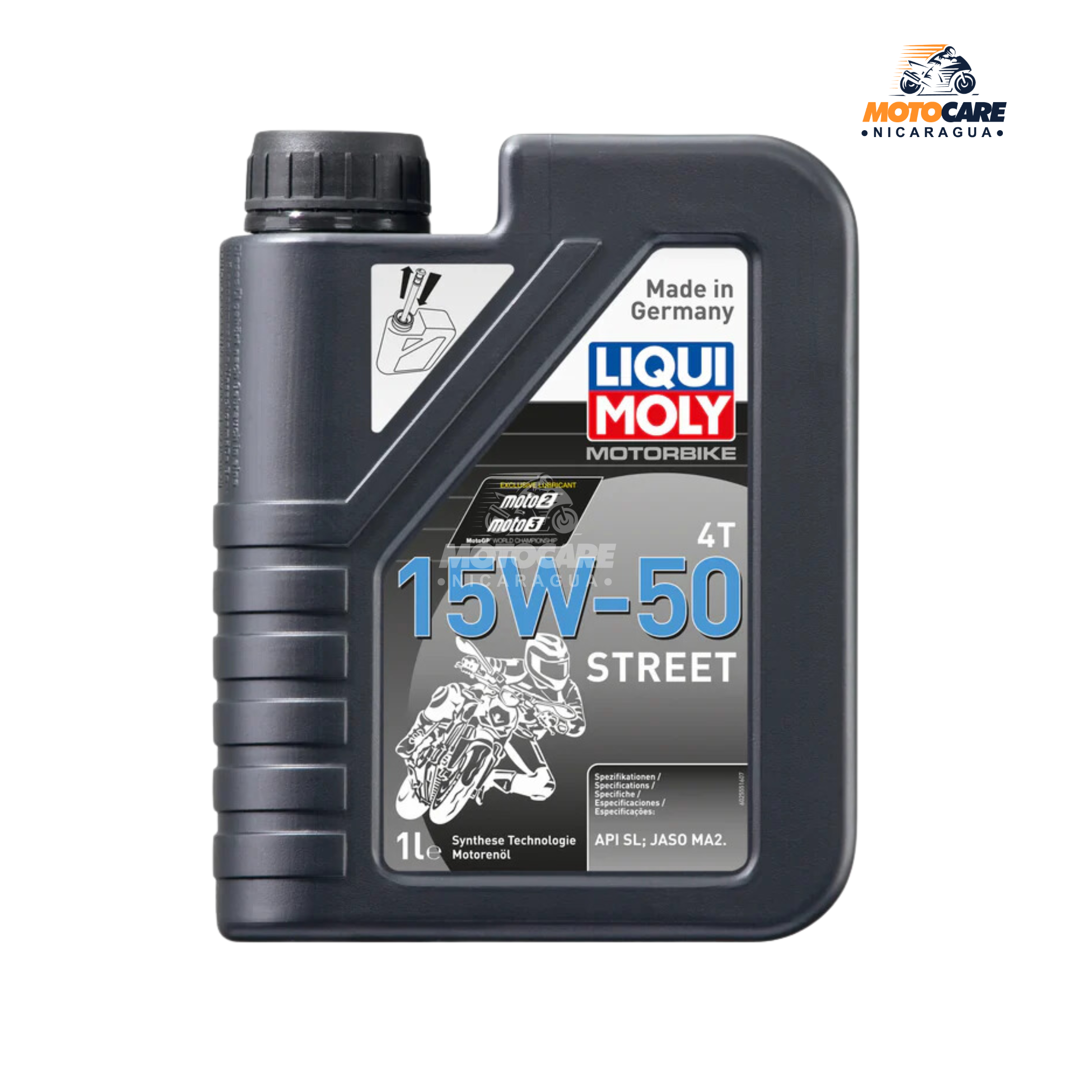 Liqui Moly 4T Street Sintético 15W-50 es un aceite de motor de tecnología sintética avanzada diseñado para motores de motocicletas de 4 tiempos, tanto con refrigeración por aire como por agua. Su formulación garantiza máximo rendimiento y protección en todas las condiciones de uso, desde desplazamientos urbanos hasta conducción deportiva o exigente en carretera.
